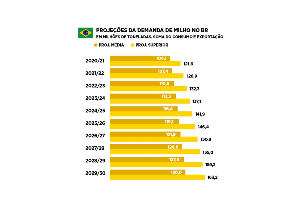 O Mapa faz uma projeção média da demanda de milho no Brasil até a safra 2029/30 que deve ultrapassar os 130 milhões de toneladas quando somados consumo interno e exportações. Se consideramos a projeção superior, os números ficam ainda maiores e a projeção da demanda ultrapassa os 160 milhões de toneladas.
