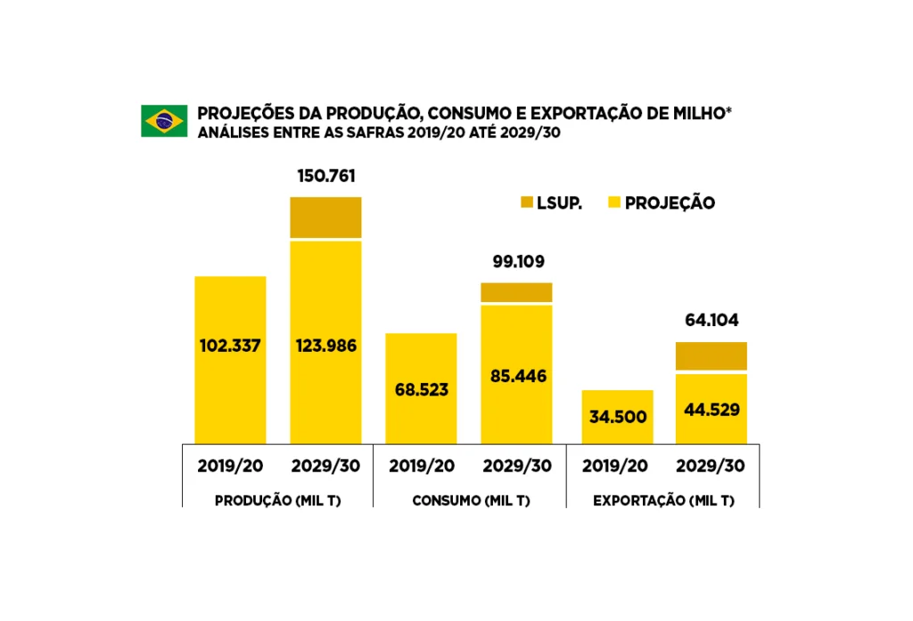 A produção nacional do cereal na safra 2019/20 foi de 102,33 milhões de toneladas e a estimativa é para a safra 2029/30 é de 123,98 milhões de toneladas. Se considerarmos o limite superior, esse número ultrapassa os 150 milhões de toneladas.