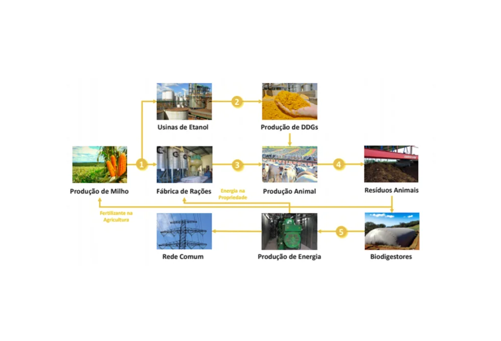 1. A produção animal, que consome tanto os DDGs como as formulações provenientes da indústria, gera resíduos (dejetos) que podem ser reutilizados tanto pela agricultura, como fertilizante e produção de eletricidade.