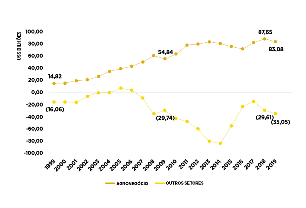 Esse valor corresponde a cerca de US$ 3,4 bilhões de crescimento no ano. Isso mostra a força do agronegócio que, comparado com os outros setores, consegue compensar o resultado negativo e injetar mais US$ 48,03 bilhões à economia brasileira. Confira no gráfico abaixo: