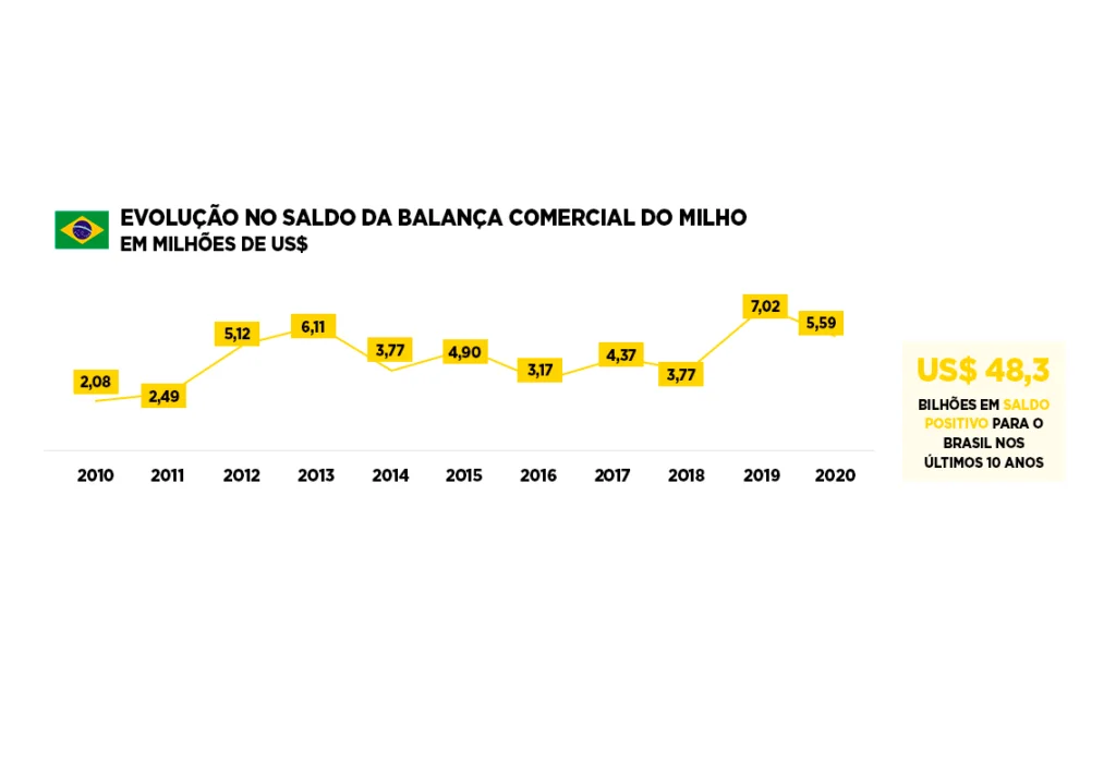 O período de 2010 a 2020 proporcionou anos excepcionais para o milho brasileiro, com destaque para 2019 e 2020. O produto saiu de US$ 2,08 bilhões em 2010 para US$ 5,6 bilhões em 2020, um crescimento de 2,7 vezes (ou 168%) no período. Com resultados positivos em todos os anos da década, o milho entregou saldo de quase 50 bilhões de dólares ao Brasil.